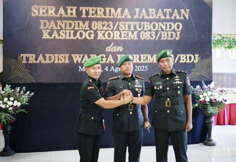 Malang – Komandan Korem 083/Baladhika Jaya Kolonel Inf Kohir memimpin langsung prosesi Serah Terima Jabatan (Sertijab) Komandan Kodim 0823/Situbondo dan Kepala Seksi Logistik Korem 083/Bdj, bertempat di Aula Untung Suropati Makorem 083/Bdj, Jl. Bromo No. 17, Kota Malang, Senin (4/8/2025).