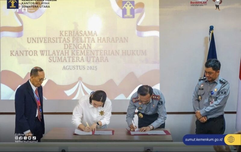 Penandatanganan dilakukan oleh Dekan Fakultas Hukum UPH, Velliana Tanaya bersama Kepala Kantor Wilayah Kementerian Hukum Sumatera Utara, Ignatius Mangantar Tua Silalahi.